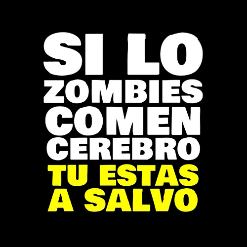 El diseño central de esta camiseta es sencillo pero contundente: sobre un fondo negro profundo que realza los colores, la frase «SI LOS ZOMBIES COMEN CEREBRO»
