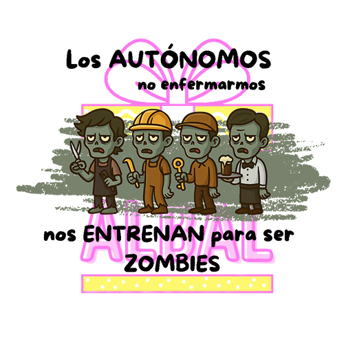 El diseño presenta una divertida ilustración de varios «zombies» con cascos de obra y maletines, acompañados de la frase «Los Autónomos no enferman más, nos entrenan para ser ZOMBIES«. Este mensaje captura de forma satírica y amena el sacrificio y la resiliencia de los trabajadores por cuenta propia, que a menudo se ven obligados a trabajar incluso cuando no se sienten bien.