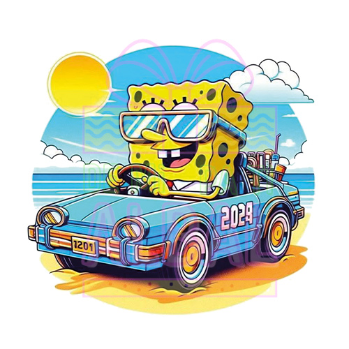 El diseño central es una joya de la animación: Bob Esponja, con sus gafas de sol y su inconfundible entusiasmo, conduce un elegante coche deportivo en la playa.