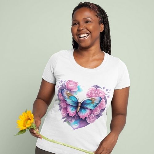 La camiseta «Corazón de Mariposa» es más que moda; es una expresión de individualidad y un recordatorio constante de la belleza que nos rodea.