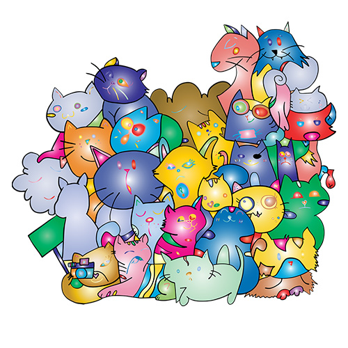 Decenas de adorables felinos se agrupan en una especie de montaña o amalgama, cada uno con su propia expresión y tonalidad: azules, rosas, verdes, amarillos, morados, naranjas…