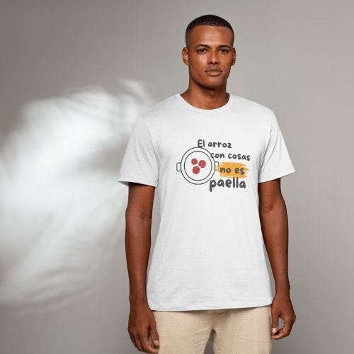 Esta camiseta de manga corta «El arroz con cosas no es paella» es también un regalo perfecto para aquellos amigos y familiares que comparten tu pasión por la buena cocina y el respeto por las tradiciones culinarias.