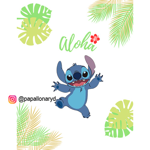 Esta prenda presenta al entrañable extraterrestre Stitch de Lilo & Stitch en una pose alegre, junto con la palabra «Aloha» escrita con un toque tropical y adornada con una flor roja.