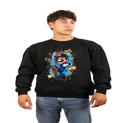 En el centro de la sudadera, Mario, el famoso fontanero de Nintendo, se muestra saltando con energía, mientras esquiva y salta sobre las piezas de Tetris que caen desde arriba.