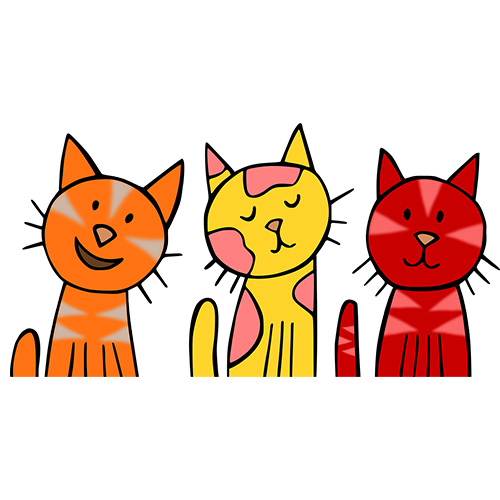 Tres gatos encantadores y coloridos, cada uno con su propia identidad, destacando sobre un fondo blanco que acentúa su vibrante paleta.
