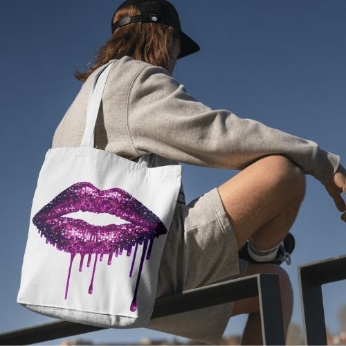 El diseño principal de esta tote bag es una asombrosa huella de labios en un profundo tono púrpura o fucsia oscuro, embellecida con un efecto de purpurina que captura la luz con cada movimiento. Cada destello simula partículas de glitter, creando una textura visual rica y un brillo que atrae la mirada. Lo que hace que este diseño sea verdaderamente único son los «goteos» de color que caen desde la parte inferior de los labios, añadiendo un elemento de arte callejero y un toque de audacia líquida que diferencia a esta tote bag de cualquier otra. Este beso púrpura y goteante se convierte en un punto focal dinámico y lleno de personalidad.